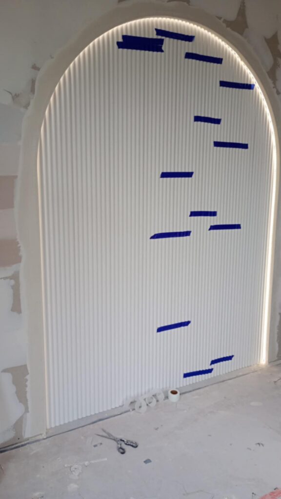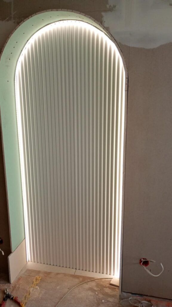 Pierwsze dwa tygodnie to prace GK i elektryka. Łuki wymagały starannego wytyczenia – szablony cięte pod każdy łuk osobno, bo kąt i promień były identyczne w kilku miejscach i każde odchylenie dałoby się zauważyć na gotowym efekcie. Elektryk równocześnie prowadził kanały pod taśmy LED i okablowanie pod lampy.