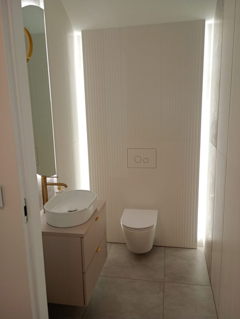 Trzeci tydzień to malowanie, płytki w toalecie i montaż paneli ryflowanych. Panele na łukach wymagały docięcia pod krzywiznę – robimy to na miejscu, bo każdy łuk jest nieco inny. Toaleta szła równolegle: hydroizolacja, płytki, ceramika. Złota armatura i akcesoria nakręcały standard całego pomieszczenia – tu nie ma miejsca na niestaranne fugi ani niedokładny montaż.
