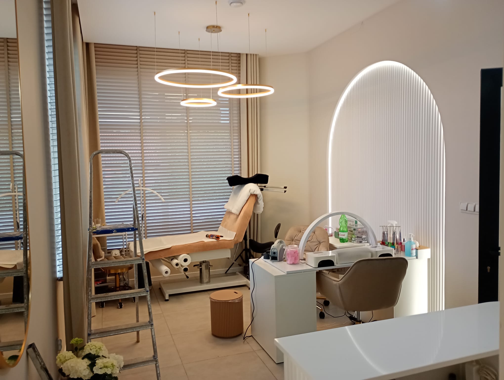 Salon jest spójny wizualnie od progu do gabinetu. Ryflowany motyw – na niszy, ladzie, w toalecie – trzyma całość razem bez wrażenia przeładowania. Podświetlenie LED w łukach robi robotę nawet przy dziennym świetle, a wieczorem buduje klimat, który w salonie beauty jest równie ważny jak sama usługa.